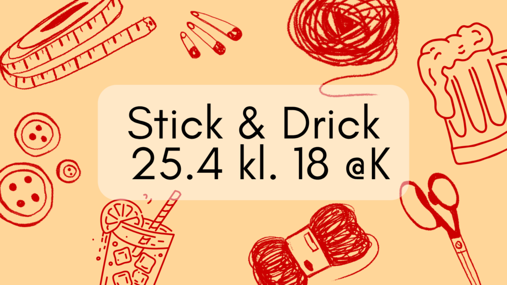 Är du i behov av ett mer chill evenemang på vappveckan? Då är stick & drick ett perfekt evenemang för dig. Till evenemanget kan du ta med dig din egna stickning/virkning eller sy nya märken på din halare! Man får arbeta på dessa i mysig stämning på K och gärna även ta med sig en rolig, ovanlig dryck.